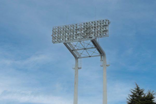 6基あるテーパーポール2本柱(高さ40m)の照明塔は、照明効率を良くする為にグラウンドより10mのはね出し方式を採用しています。