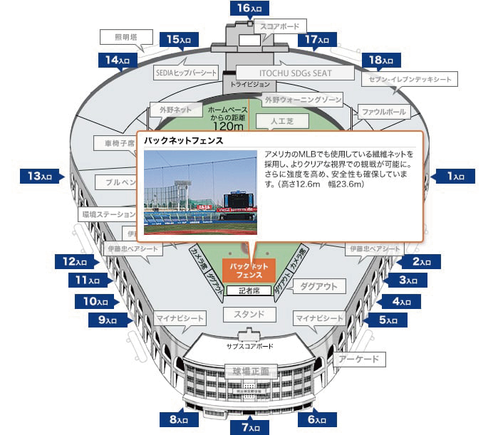 アメリカのMLBでも使用している繊維ネットを採用し、よりクリアな視界での観戦が可能に。さらに強度を高め、安全性も確保しています。(高さ12.6m 幅23.6m)