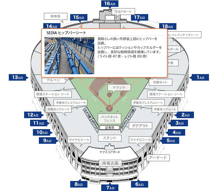 内野エリア(1塁側・3塁側)のフェンスネットの高さを従来の4mから50cm下げ3.5mとし、支柱の数を従来の64本(1塁・3塁合計)から30本へ大幅に削減、またフェンス上部の鋼材をワイヤーへと変更(一部を除く)しました。これにより、内野席での観戦が今まで以上に迫力が増し、快適にお楽しみいただけるようになりました。(平成24年より)